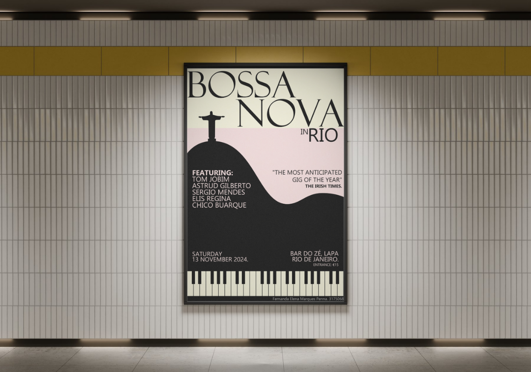This poster was designed in Photoshop to promote a Bossa Nova event. The composition prioritizes clarity and hierarchy: the featuring artists, venue, date, and location are prominently placed to ensure essential details are immediately visible.