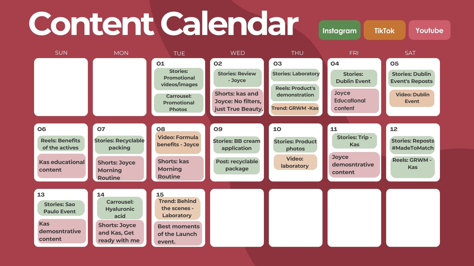 Content is distributed consistently across platforms: Instagram; TikTok, to tap into trends through formats such as GRWM and ASMR unboxings; and YouTube Shorts (twice per week) for quick, educational tutorials.